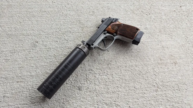 beretta 30x Tomcat with barrel tilted up and SilencerCo Spectre 9 suppressor attached