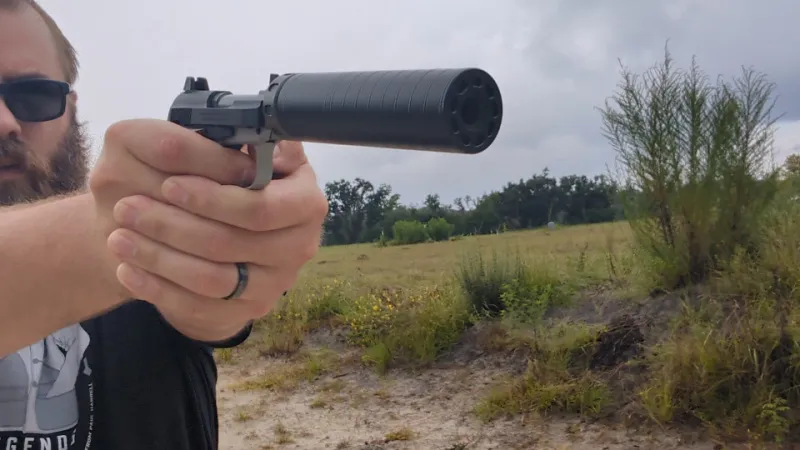 pocket pistol in hand with SilencerCo Spectre 9 suppressor