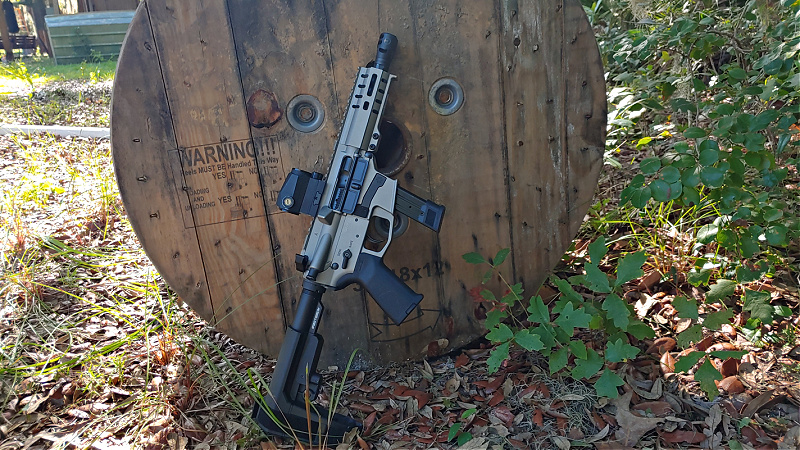The Banshee with the braced variants come with the SBA3 modified by CMMG to open rapidly with their Fastback design. This allows you to preset your chosen position and just pull the brace, and it will deploy to that position. A Magpul pistol grip is a nice touch, and the handguard has a built-in hand stop to prevent your hand from slipping forward and in front of the very short barrel.
