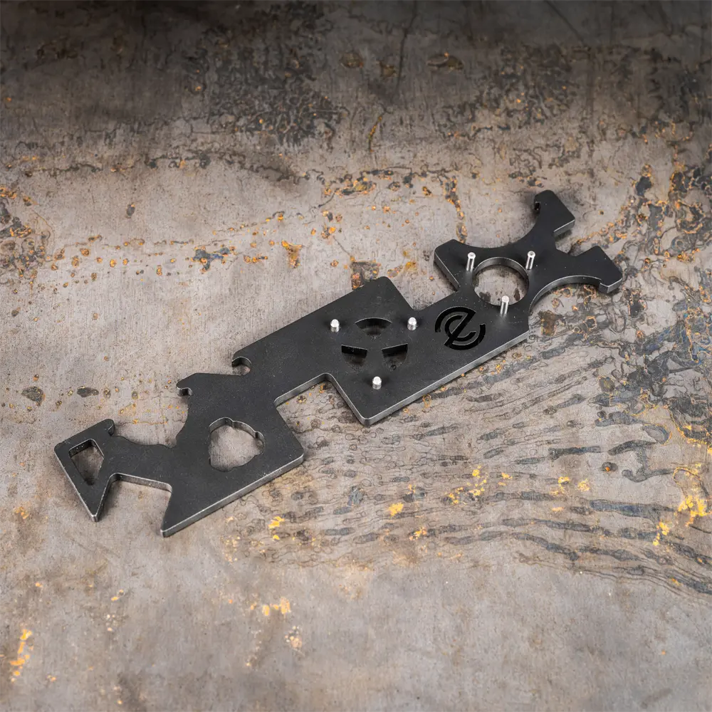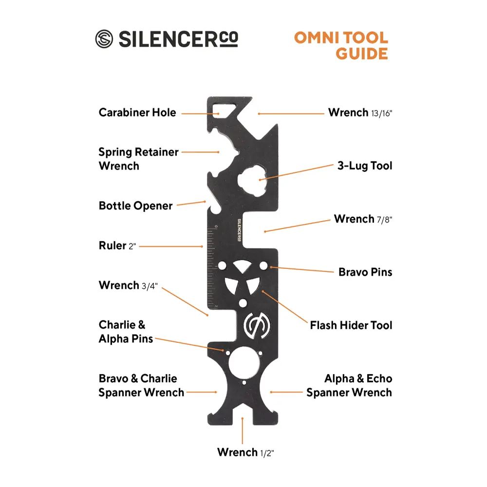 Introducing the Omni Tool. This tool is the universal SilencerCo tool, capable of handling Alpha, Bravo, Charlie compatible suppressors and accessories. This tool is the Bravo Multi Tool, Charlie Multi Tool, and Alpha Piston Tool, all in one tight package. It also has a bottle opener on the side to make it an every day carry tool, and a carabiner slot so that you can easily pack it to the range. It is built to tighten and remove front caps, mounts, and muzzle devices. Can be used with a Spanner Wrench to remove mounts from the suppressor bodies.
