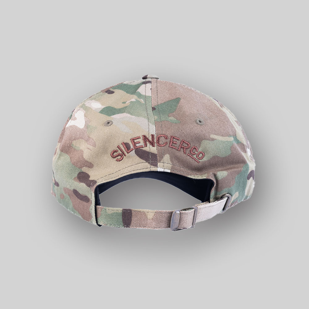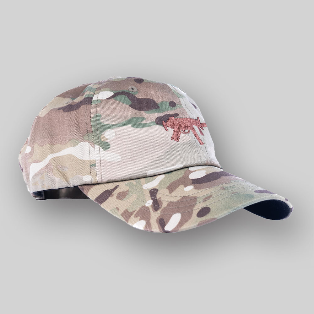 It’s concealed in the camo – just like a PDW should be. This green multicam hat features a camouflaged personal defense weapon with a dad-style fit.